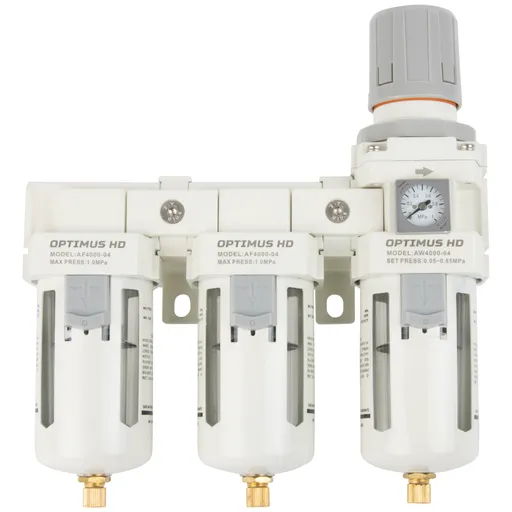 Блок подготовки воздуха 1/2" трехступенчатый с влаго-маслоотделителем, регулятором и манометром OPTIMUS HD AFFW4000-04 - это система подготовки воздуха для работы с пневматическим инструментом.