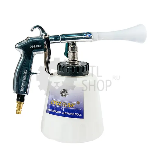 Идеальный пневматический инструмент для очистки труднодоступных участков, таких как вентиляционные каналы, направляющие сидений, чехлы рычагов переключения передач, дверные притворы и т. д., а также для удаления стойких загрязнений с пластмассы и текстиля (ковриков, крыш кабриолетов и т. д.). Идеально подходит также для быстрой очистки полировальных губок. Благодаря эффекту циклона (завихрения) частицы грязи, соединенные с чистящим раствором, с очень большим усилием высвобождаются из обрабатываемых поверхностей. Затраты труда значительно уменьшаются. При выключенной подаче химикатов (для этого нужно просто перевести рычаг в другое положение) циклон также отлично подойдет для удаления пыли и сушки очищенных поверхностей.