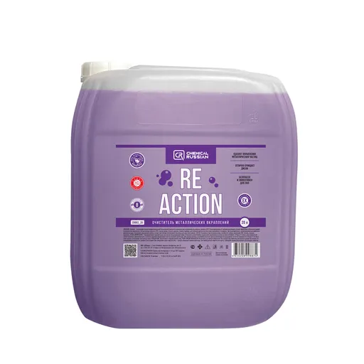 ReAction - высокоэффективный профессиональный бескислотный очиститель металлических вкраплений для колесных дисков и ЛКП. Сбалансированная рН-нейтральная формула состава эффективно и безопасно удаляет металлические вкрапления с легкосплавных дисков и ЛКП, а также хрома, стекла и пластика. Отлично подойдет для глубокой очистки при подготовке автомобиля к полировке. При взаимодействии с загрязнениями окрашивается в фиолетовый цвет, что является индикатором работы состава (при наличии загрязнений). Безопасен для всех типов дисков.