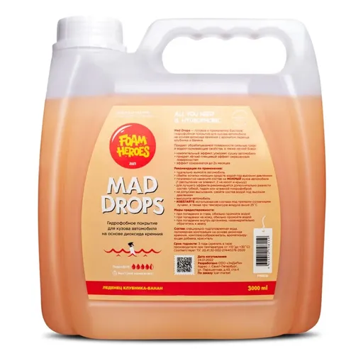 Mad Drops - готовое к применению быстрое гидрофобное покрытие для кузова автомобиля на основе диоксида кремния с ароматом клубнично-бананового леденца, объемом 3 литра.