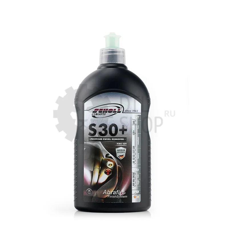 Высокоэффективное соединение S30+ гарантирует идеальную полировку темной краски. Благодаря уникальной рецептуре, в основе которой лежит мелкозернистая микрочастица, чистейший порошок оксида алюминия, легкие царапины и умеренные признаки износа верхнего слоя ЛКП, а так же следы от вихрей (барашков) и голограммы от предыдущих полировальных работ можно легко и эффективно устранить всего за один шаг.