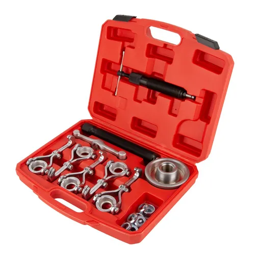 Подходит для снятия ступиц с 3-5 шпильками, тормозных дисков и барабанов, а гидравлический цилиндр на 10 т, который идет в комплекте, позволяет, не применяя ударный инструмент, снять даже плотно прикипевшие детали.