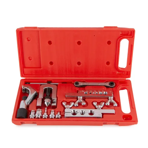 Набор включает адаптеры для формирования двойных раструбов, а также развальцовки и резки медных и латунных трубок. Набор оснащен литой стальной муфтой с хромированием.