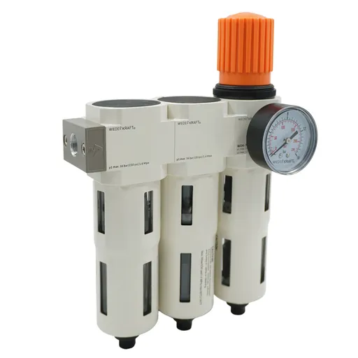 Блок подготовки воздуха 3/8" трехступенчатый с влаго-маслоотделителем, регулятором и манометром WiederKraft WDK-70730FA - это система подготовки воздуха для работы с пневматическим инструментом.