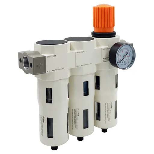 Блок подготовки воздуха 3/4" трехступенчатый с влаго-маслоотделителем, регулятором и манометром WiederKraft WDK-70760FA - это система подготовки воздуха для работы с пневматическим инструментом.