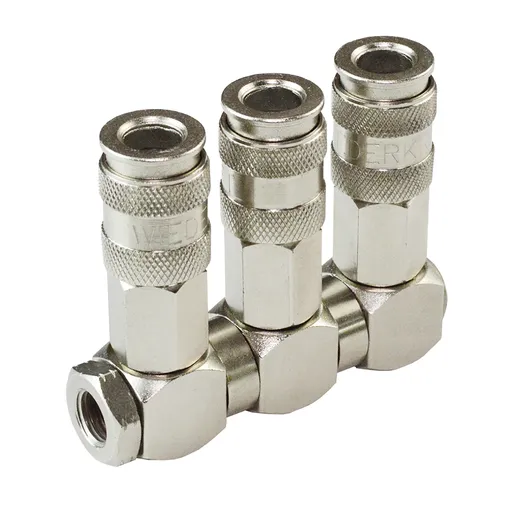 WIEDERKRAFT WDK-83RT Разветвитель пневматический с вращающимися соединениями, вход 1/4"F, 3 выхода БРС используется совместно с компрессорным оборудованием для подключения пневмоинструмента. Изготовлен из стали. Оснащен тремя вращающимися разъемами рапид тип «мама». Диаметр резьбы входного отверстия - 1/4".