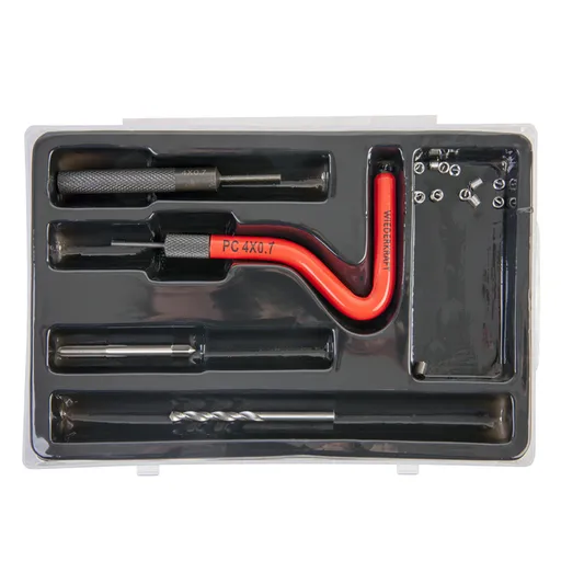 Данный набор, состоящий из специальных инструментов, разработан для восстановления повреждённых резьбовых соединений. Комплектация включает сверло, вороток, боек, метчик STI и резьбовые вставки различных размеров, изготовленные из нержавеющей стали.