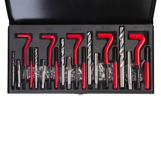 Данный набор, состоящий из специальных инструментов, разработан для восстановления повреждённых резьбовых соединений. Комплектация включает сверло, вороток, боек, метчик STI и резьбовые вставки различных размеров, изготовленные из нержавеющей стали.