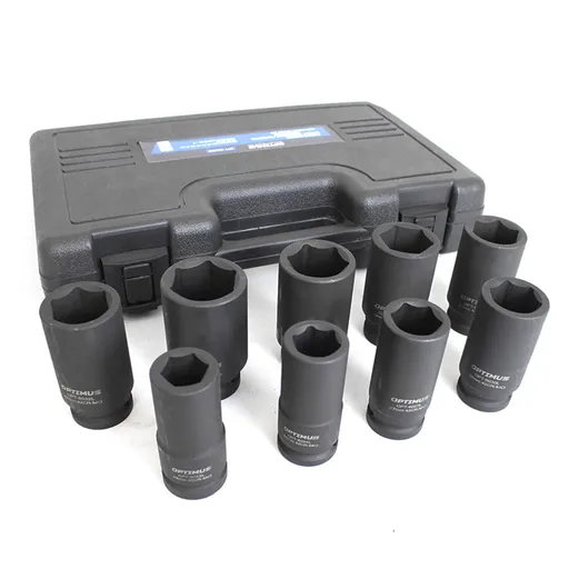 Набор ударных головок глубоких 9 шт, 22-38 мм, 3/4"DR Optimus OPT-60209 применяется для демонтажа-монтажа туго завинченного крепежа с помощью гайковертов ударного действия, пневматических или электрических.
