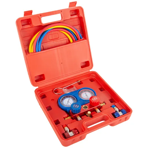 В комплект входит два манометра (для измерения давления в каждом из контуров кондиционера), штуцеры с вентилями и три гибких цветных шланга. Красный шланг подключается к контуру высокого давления, синий — к низкому. Все соединения стандартизированы и герметичны, а вентильная система обеспечивает точную и безопасную подачу хладагента.